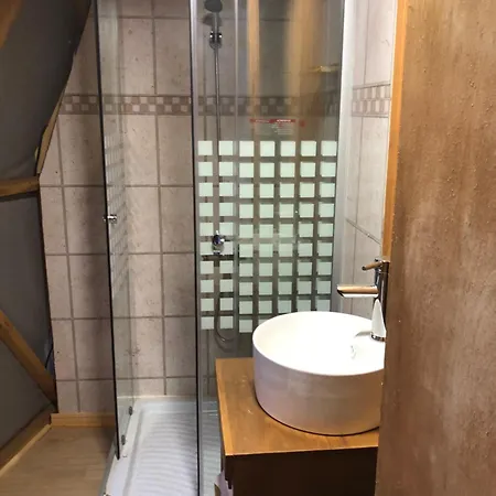 Bathroom facilities also include a walk-in shower and a separate toilet. Towels are included for added comfort.
